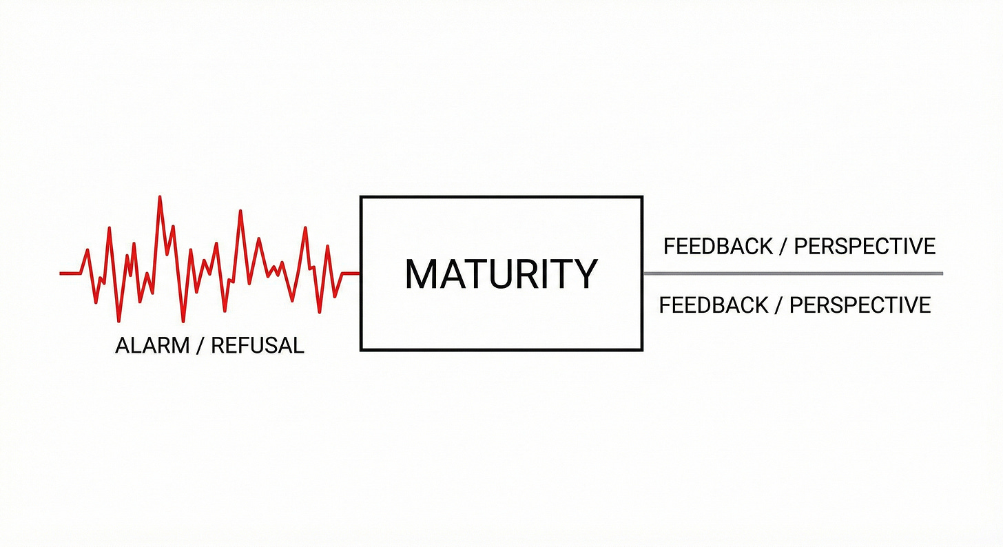 I’m interested in the next layer: what that corridor trains in the person moving through it. When continuity is the goal, a system doesn’t need your refusal. It works better when refusal arrives already softened. Alarm becomes “a concern.” A demand becomes “feedback.” Clarity becomes “a perspective.” Language absorbs the failure without reversing it, the same way reassurance can substitute for obligation.